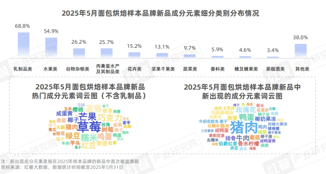 从新品的成分元素细分类别情况来看,乳制品类作为面包、蛋糕、糕点的基础原料,在新品中的占比最多;水果类作为面包烘焙产品的经典搭配,占比亦超过五成。
