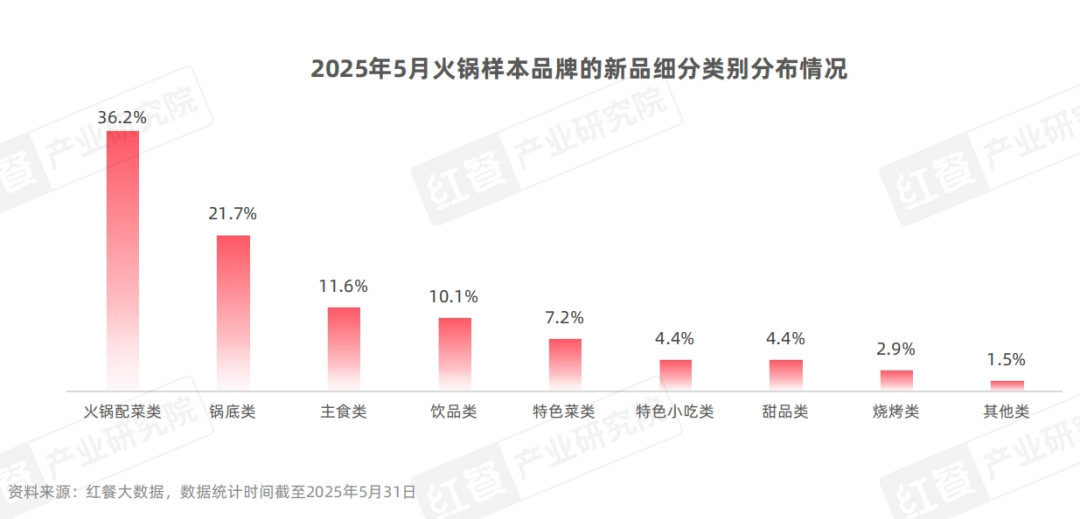 2025年5月,在红餐产业研究院监测的火锅品牌中,有19个品牌共推出了69款新品。从新品的细分类别来看,当月火锅新品涵盖的类别有火锅配菜类、锅底类、主食类、饮品类、特色菜类、特色小吃类、甜品类、烧烤类和其他类。