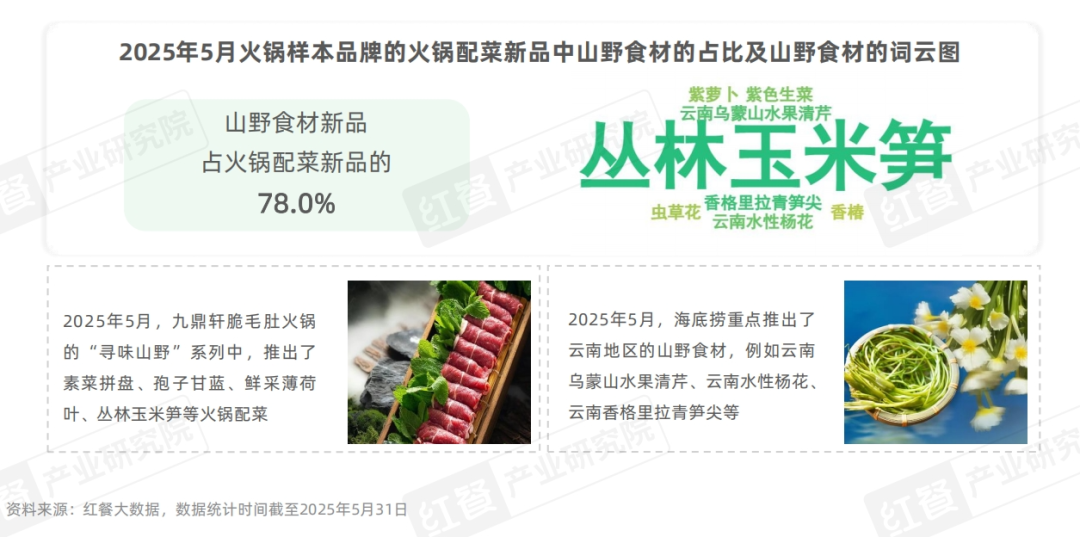 其中,火锅配菜类的新品数量最多,共计25款,占新品总数的36.2%。其中,山野食材的占比为78%,表明山野食材成为火锅品牌研发新品的核心方向,反映出品牌对健康化、特色化菜品的重视。从具体的词云图来看,山野食材种类较为多样,涵盖了孢子甘蓝、薄荷叶、紫色生菜、虫草花、水性杨花、香椿等山野食材。此外,云南山野食材是5月火锅品牌挖掘的重点,品牌借助云南特色食材的稀缺性与独特性,为消费者带来“天然山野+地域风味”的沉浸式火锅体验。