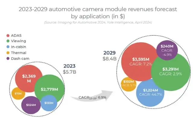 根据Yole Group最新的报告称,2023年全球汽车摄像头市场规模已经达到了57亿美元,其中汽车图像传感器市场规模达到了23亿美元,汽车镜头市场达17亿美元。预计到2029年,全球汽车摄像头市场规模的年复合增长率将达6.9%,汽车CIS的市场规模的年复合增长率将达5.2%,汽车镜头市场规模的年复合增长率将达6.5%。这主要得益于高分辨率摄像头和产品组合的更高应用。