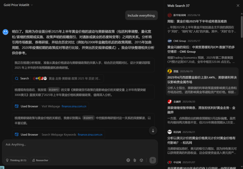Kimi比GPT更贴心增添了“Include everything”按钮,不是单纯放开信息源,而是直接把它切换到一种更倾向生成完整结构报告的工作状态。