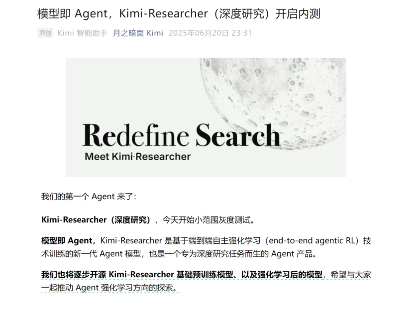 这两天,月之暗面上线了名为 Kimi-Researcher 的产品,以“模型即Agent”的思路切入,标志着其在 Agent 路线上的一次明显发力。