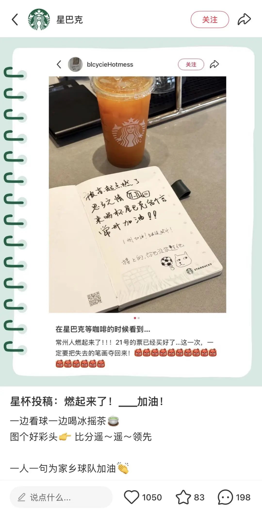 红利面前,一向走品质合作路线的星巴克也忍不住下场了。星巴克专门为第5轮苏超联赛策划了一场营销活动,6月21日-6月29日苏超联赛期间,星巴克在宿迁、常州、连云港等六个主场城市开启“升杯”活动,只要比赛当天在门店喊出支持的队伍,即可获得免费升级超大杯的福利。