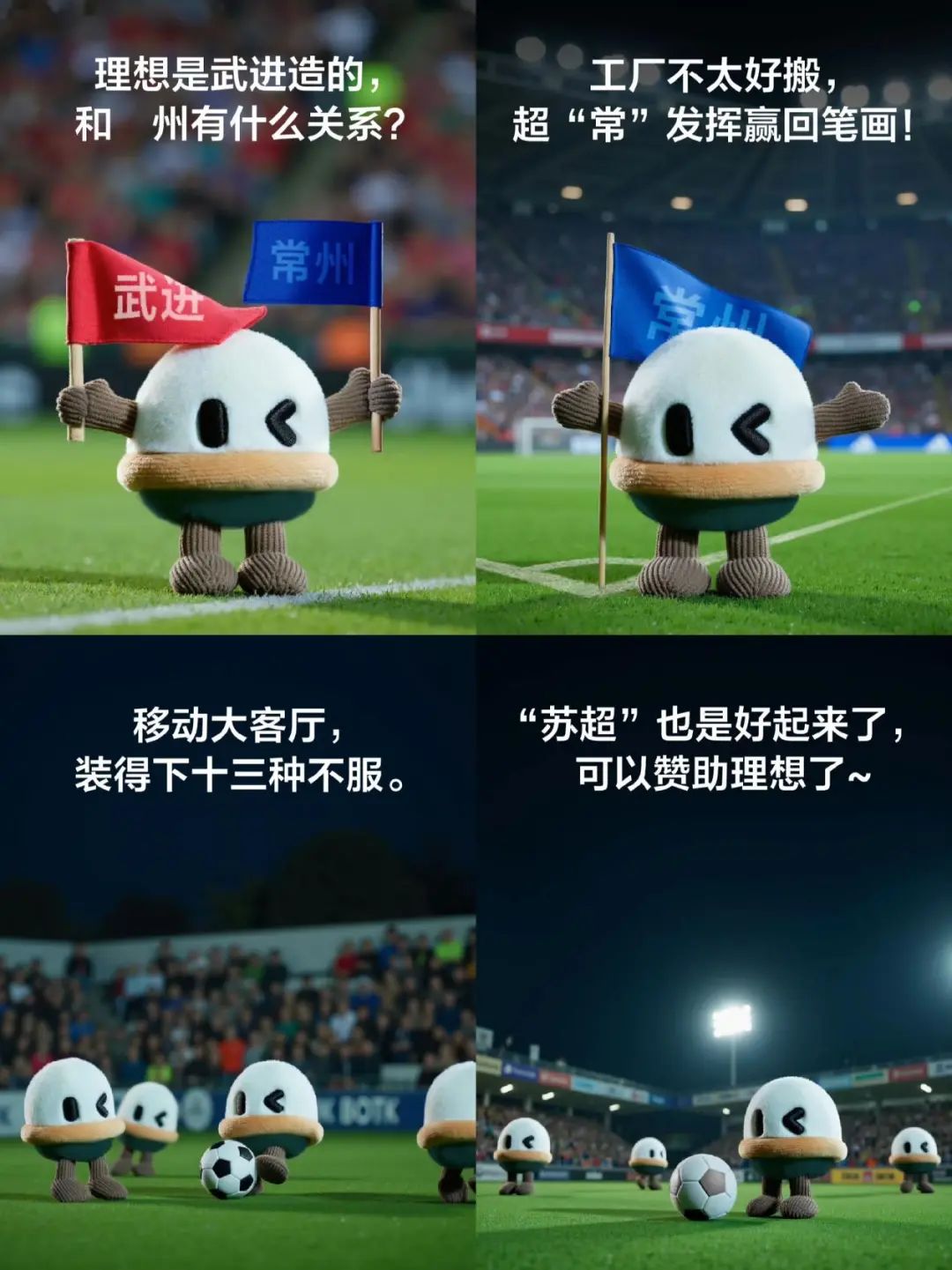 一些赞助商品牌后续的营销手段,类似理想汽车的苏超海报,就产生了这样的问题。当用户被京东、伊利等品牌的玩梗大屏轮番轰炸后,理想汽车发布的4张同样套路的海报,内容单薄的同时,产品特质也难以突出,自然会被淹没在苏超的茫茫营销大军里。