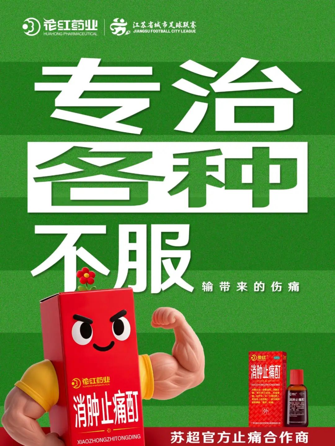 反观另一家赞助商——花红药业旗下消肿止痛酊,其借势苏超的打广告方式让人耳目一新。先是一则“严正声明”:我们的药品只负责平息比赛跌打损伤,对输球带来的心疼疗效有限!