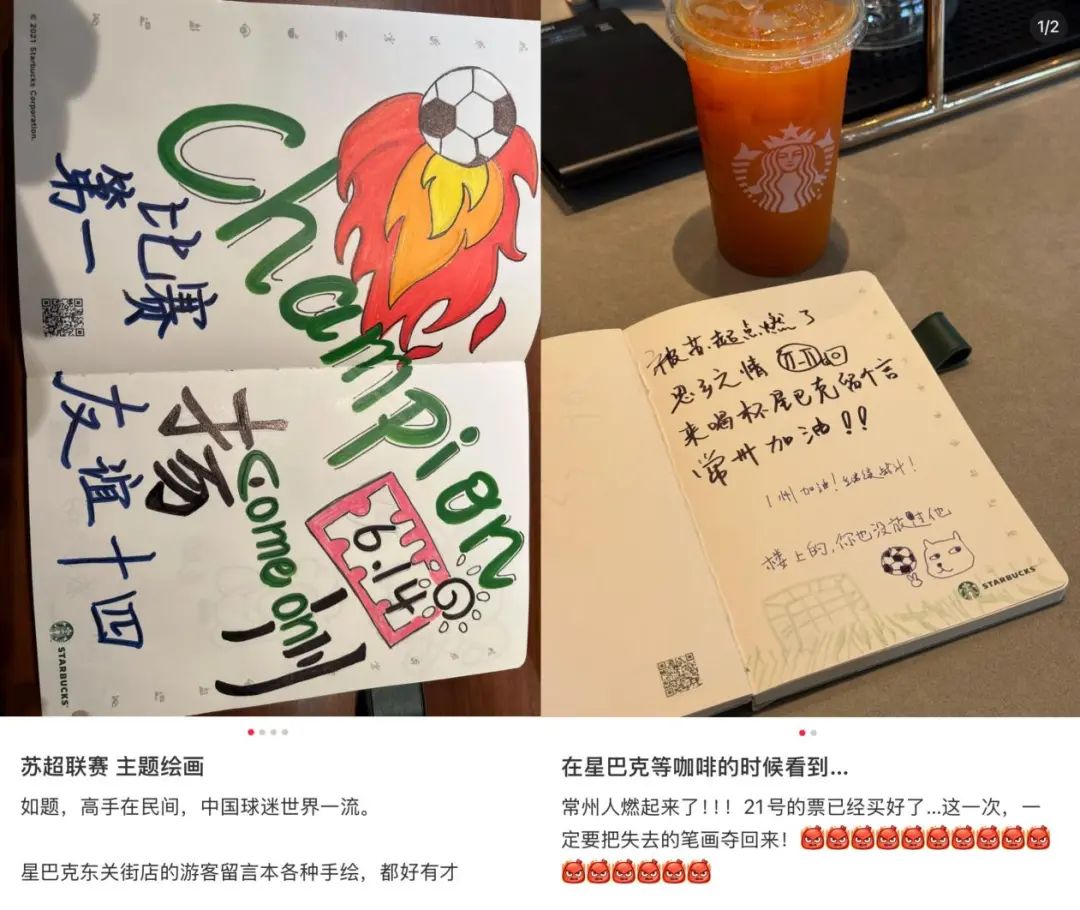 此外,星巴克还关注到了球迷们在门店留言本上富有创造性的手绘插画,并顺势传播,进一步吸引消费者线下互动。原本就具有强社交属性的留言本创意,在此时也发挥了意想不到的营销效果。