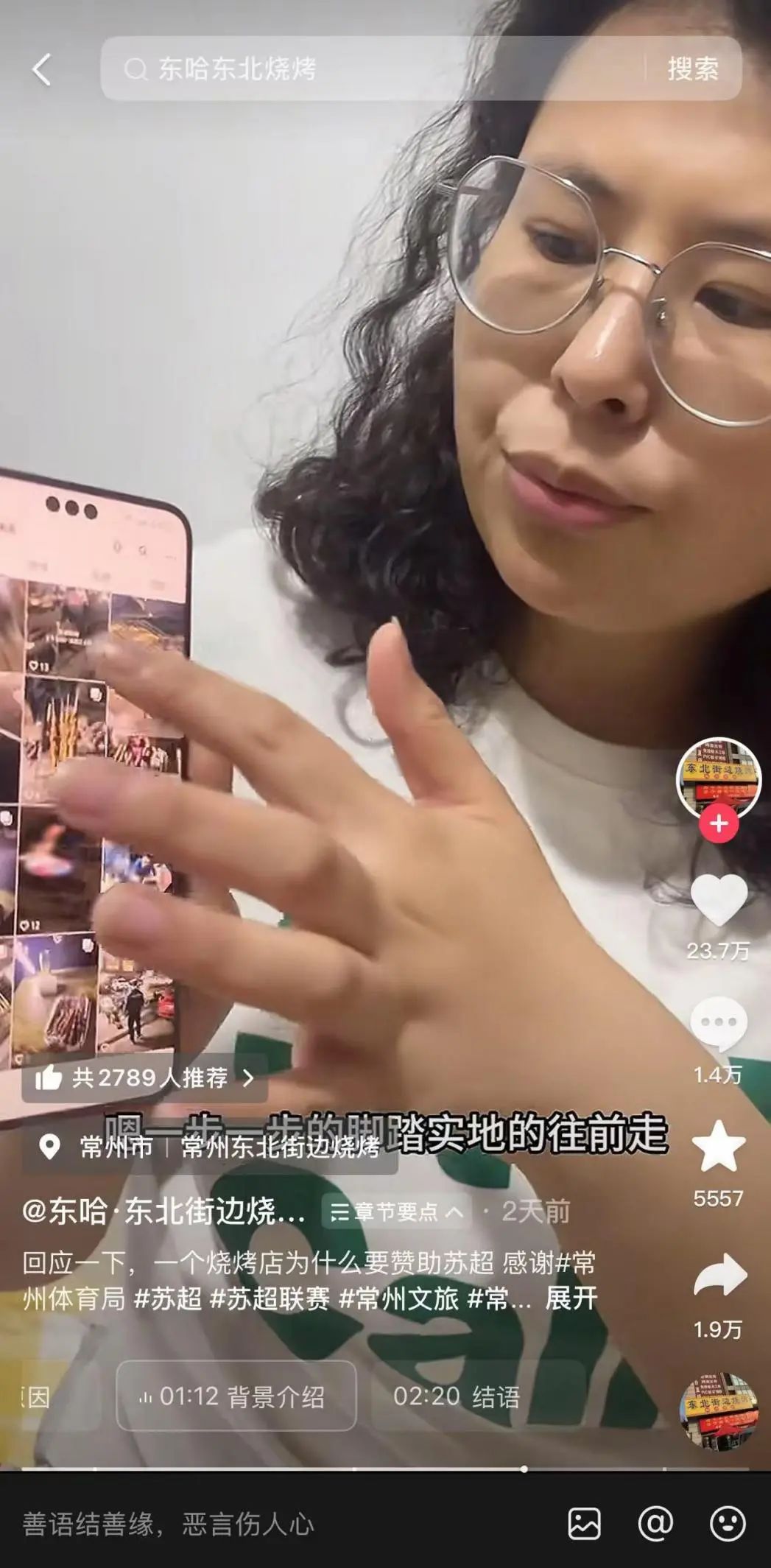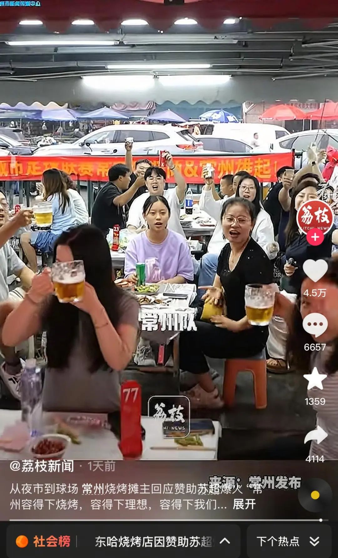 抖音平台是本地商户的主战场,除了东哈烧烤老板娘开抖音直播讲述自己的起家故事外,其他的本地商户也想从苏超赛事中分得一杯羹。据了解,6月1日,盐城对阵淮安1:0赢下比赛后,盐城某大排档老板在抖音“宴请”全盐城人喝啤酒(一炮扎啤);为了给常州队打气,当地某烟酒店老板放出“每赢一场球,我直播间就1499元出一箱茅台”的豪言,吸引超700个网友留言。