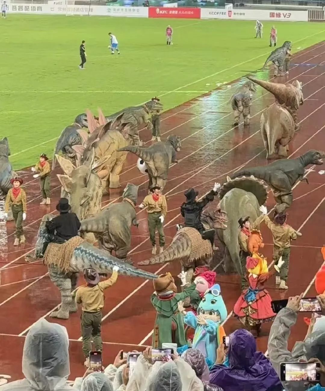 常州文旅也开始发力,抱着势必要接住流量的决心,在常州对阵南京的赛场上运来自家恐龙园的恐龙们助阵。结果在常州0:4输给南京后,恐龙宝宝疑似“当场气晕”,在互联网上也是赚足了眼球。