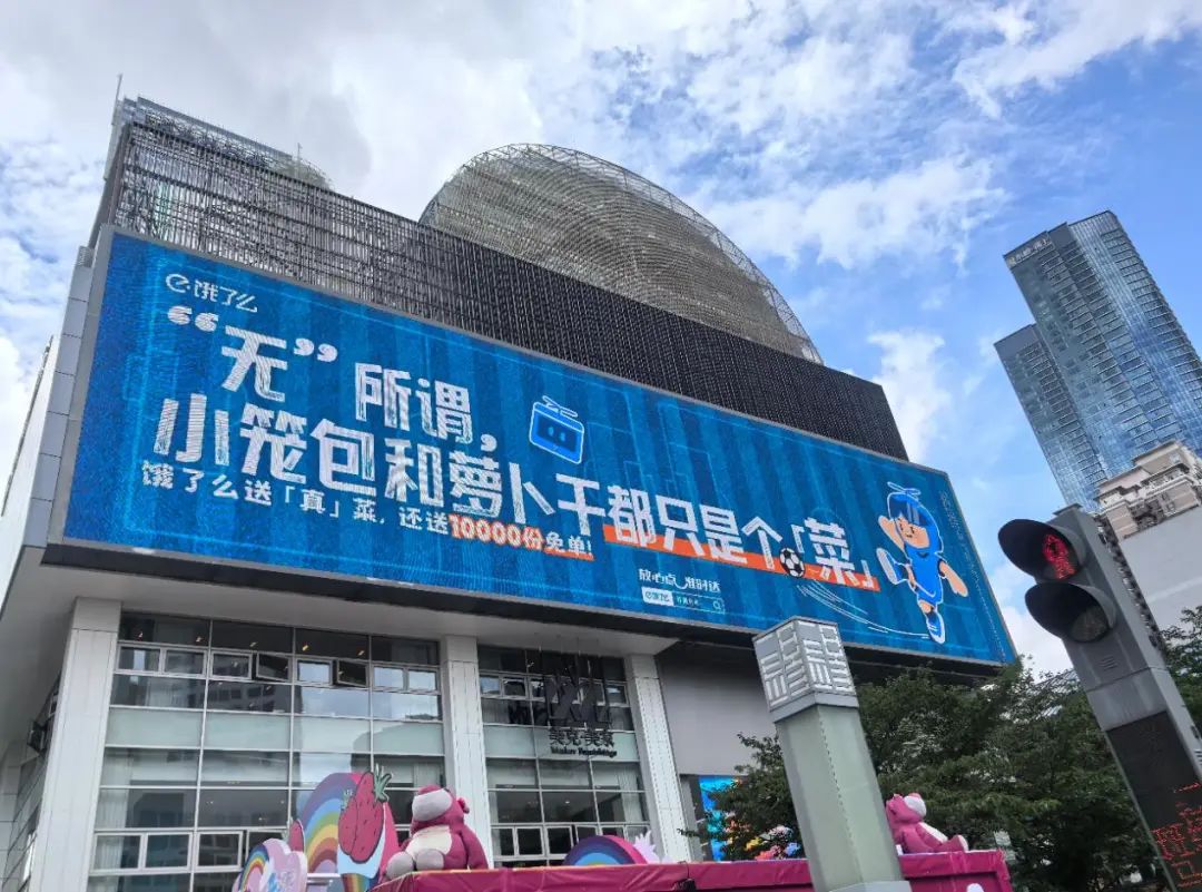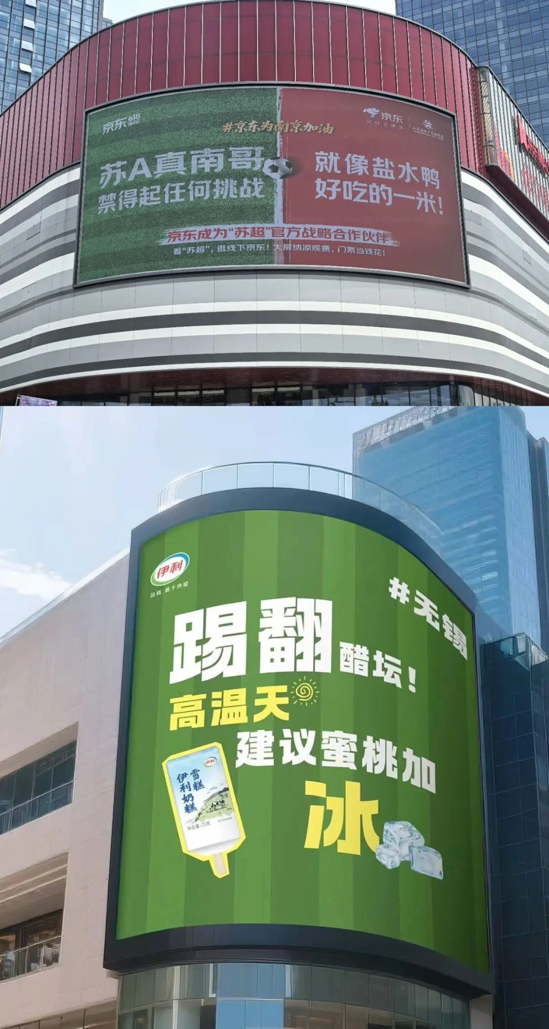 最先开始蹭热度的是美团和饿了么。两家外卖平台紧跟竞对企业京东,在6月13日京东官宣赞助苏超当天,也把自家平台的“看球配菜”送上了商场大屏。这波“擦边”,擦得不仅是苏超的边,也借竞对品牌京东的官方名头,悄悄将自己的声量起点拉高,给人一种三家外卖平台打得有来有回的既视感。