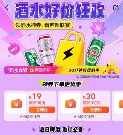 于是,美团团购适时地在江苏区域推出了“喝酒观赛”页面。酒类产品由美团闪购进行配送,约30分钟送货上门,除了啤酒之外,海之蓝、天之蓝、红花郎、低度国窖、赖茅等畅销中低端白酒也可以便捷购买,还可以享受不同程度的优惠。
