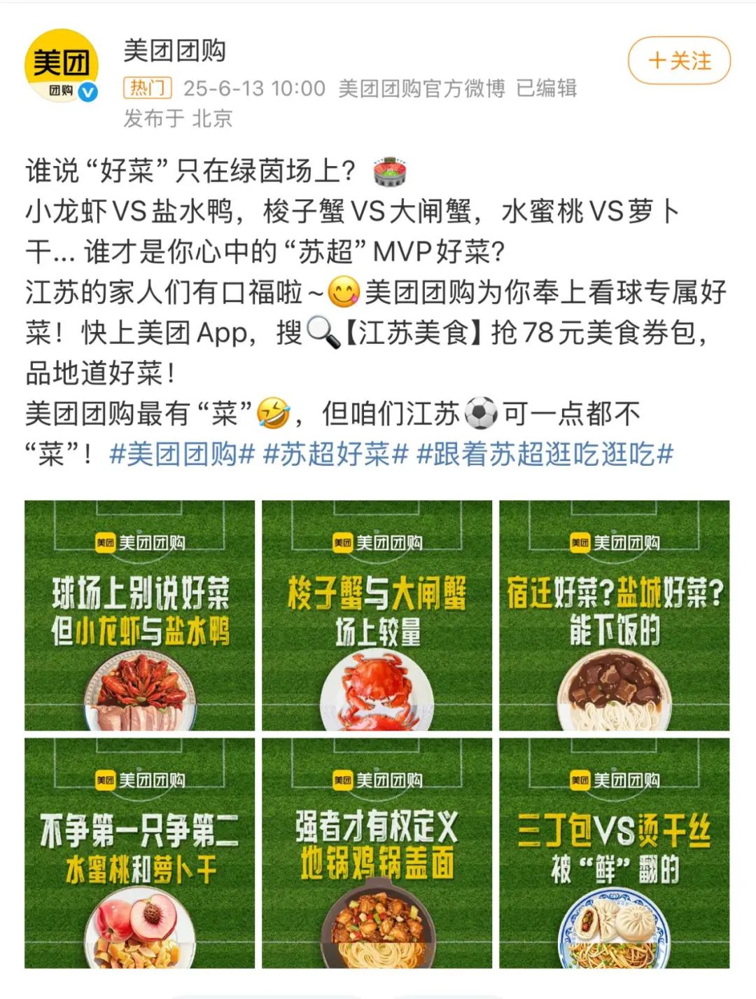 面对如此巨大的消费市场,美团的后续动作也跟上了赛事营销这个重要的节点,精确对标人群和消费场景,抓住了苏超带来的红利。