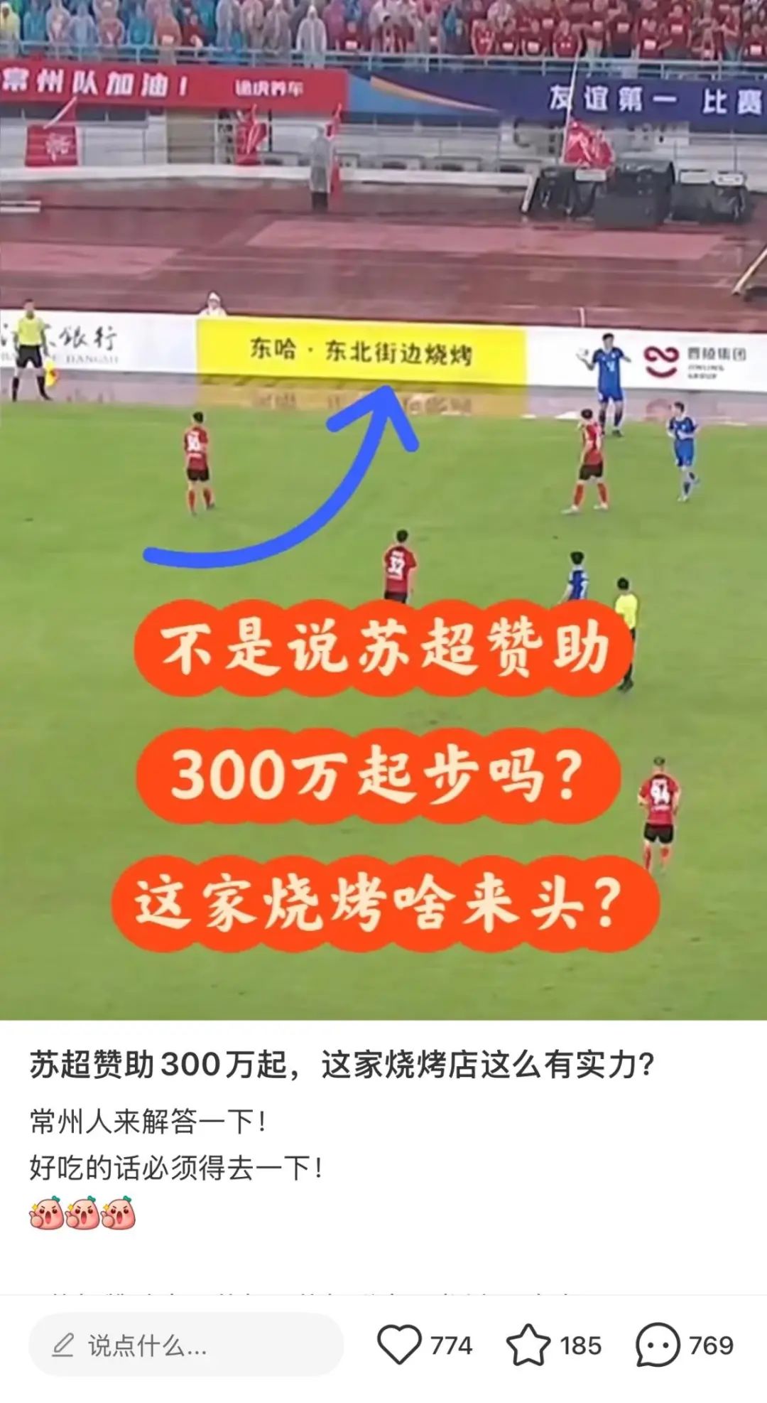 常州一家与京东、江苏银行并列赞助商的“个体户”烧烤店更是脱颖而出,凭借情感营销一夜火成地标打卡点。据了解,这家烧烤店在赛事初期就拿到了赞助席位,因为入局较早,仅凭10万元赞助费就与其他知名企业肩并肩进行场边露出。
