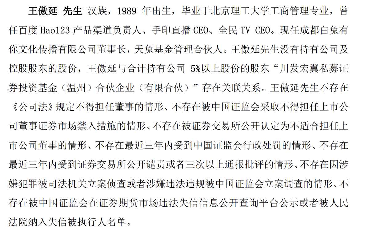 公开信息显示,兔跃呈祥实控人王傲延履历丰富,2011年在百度任职,曾主导Hao123渠道体系建设、百度贴吧商业化项目。离职创业后,王傲延操盘全民TV直播平台,2017年创立白兔集团,旗下有白兔MCN、白兔电商EC、白兔广告AD三大业务板块,白兔集团曾孵化以“骆王宇”“特别乌啦啦”“张喜喜”等为代表的现象级带货主播。