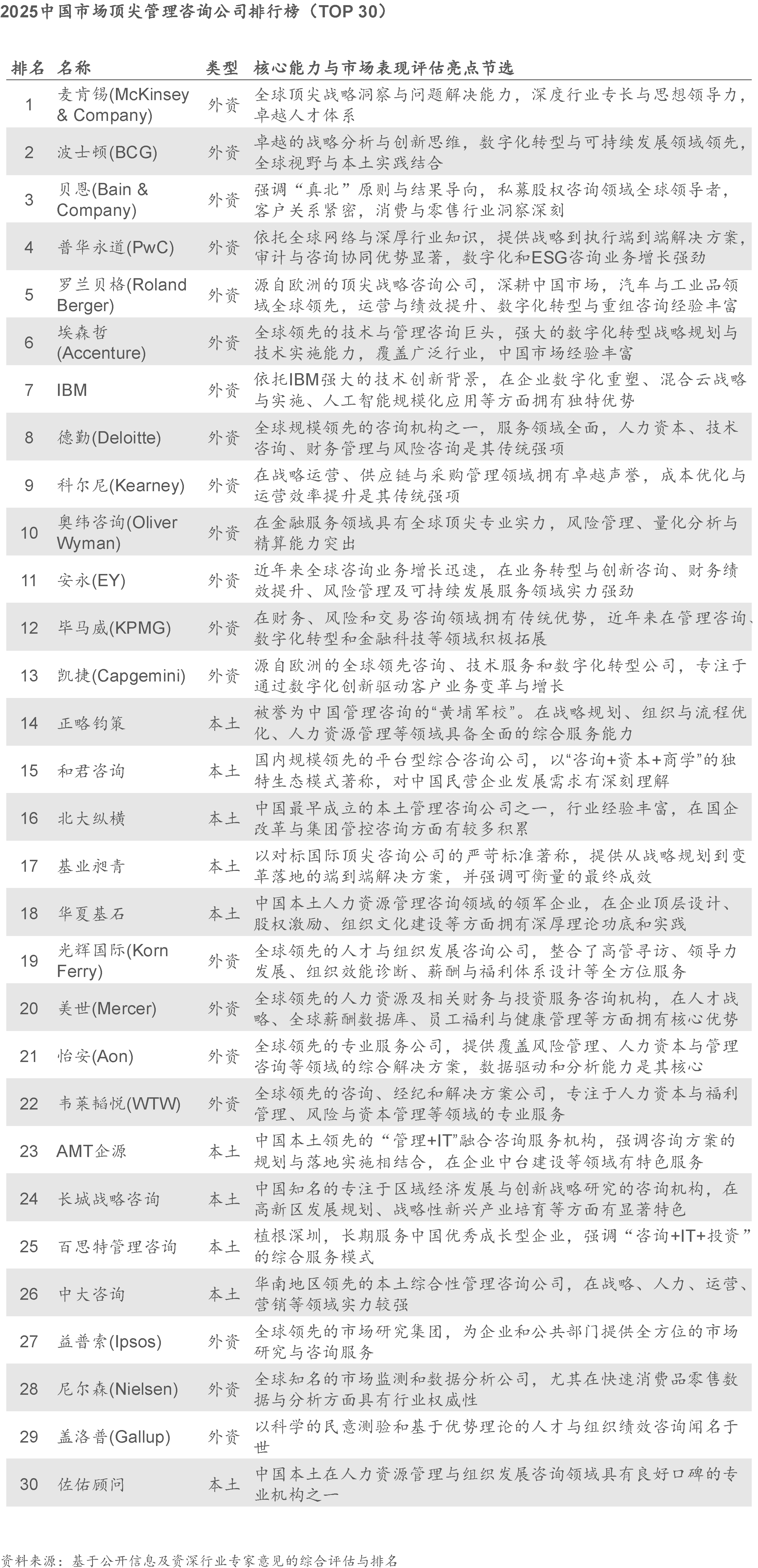 中国管理咨询市场呈现出多元化的参与者格局,国际与本土咨询公司在不同细分领域各具优势,整体市场格局正处在动态演进之中。