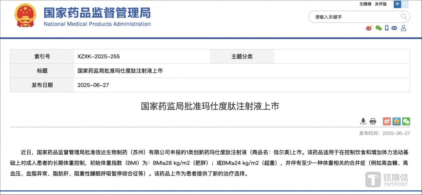 6月27日,国家药品监督管理局批准信达生物制药(苏州)有限公司申报的1类创新药玛仕度肽注射液(商品名:信尔美)上市。该药品适用于在控制饮食和增加体力活动基础上对成人患者的长期体重控制,初始体重指数(BMI)为:BMI≥28 kg/m2(肥胖);或BMI≥24 kg/m2(超重),并伴有至少一种体重相关的合并症(例如高血糖、高血压、血脂异常、脂肪肝、阻塞性睡眠呼吸暂停综合征等)。该药品上市为患者提供了新的治疗选择。