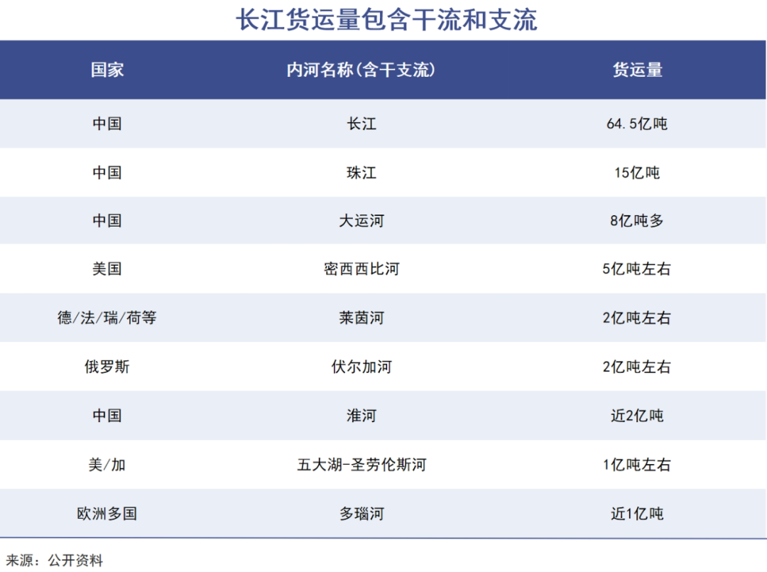 而相比欧美,我国内河航运禀赋还要更加优越。全球9大航运内河,我国独占4条,长江的运输能力更是断崖式领先。其干线货运量近20年增长了约30多亿吨,2023年长江干流及支流总货运量高达64.5亿吨。