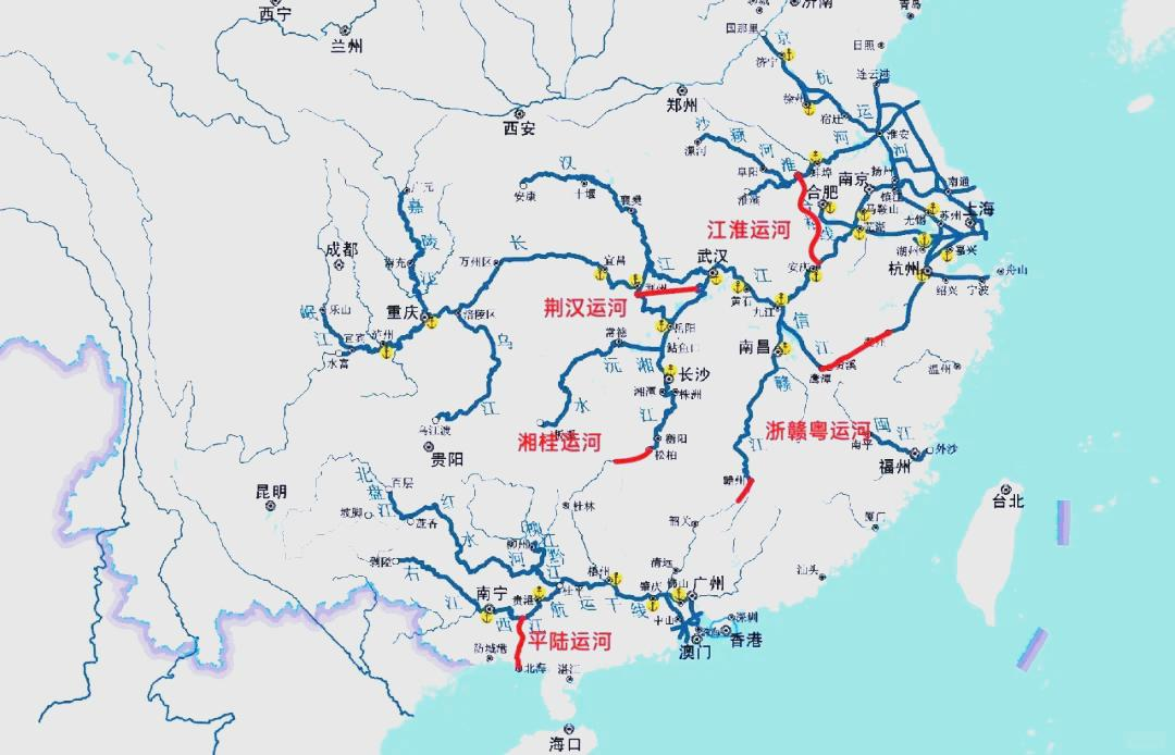 安徽投下950亿建设江淮运河,已在前年通航;广西砸727亿元建设平陆运河,计划在明年建成;湖北计划砸748亿,兴建荆汉运河,给长江来个“截弯取直”;内陆省份河南砸下1416亿,筹划47个内河水运项目,以形成“一纵三横九支”航道网,夯实中部大枢纽的地位;湖南斥资1500亿,要打通“现代版灵渠”湘桂运河,连接长江珠江;造价最高的就是赣浙粤运河,建设需要耗资3200亿元,以实现长三角和珠三角的历史性通航。