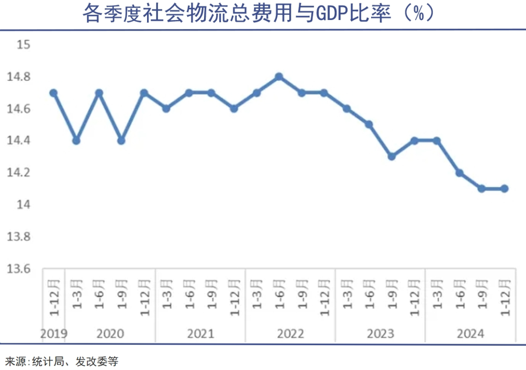 社会物流总成本在GDP中的比重,是衡量一个国家商品流通效率的关键指标。2024年,我国社会物流总费用与GDP的比值为14.1%,已降至2006年有统计以来的最低水平。