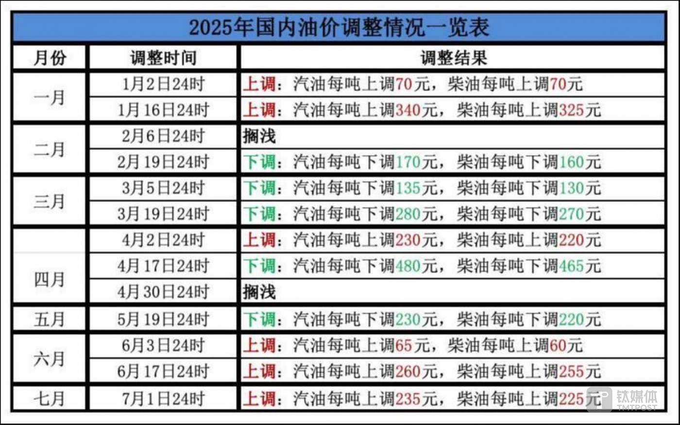2025年7月1日,国家发展改革委价格司发布公告,根据近期国际市场油价变化情况,按照现行成品油价格形成机制,自7月1日24时起,国内汽、柴油价格(标准品)分别上调235元/吨和225元/吨。