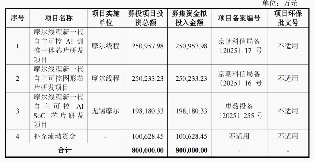 摩尔线程此次融资的主要目的也是用于研发投入和补充流动资金。根据招股书显示,募资主要用于新一代AI训推一体芯片、新一代图形芯片研发项目,以及AI 新一代SoC芯片研发,少量资金用于补充流动资金。