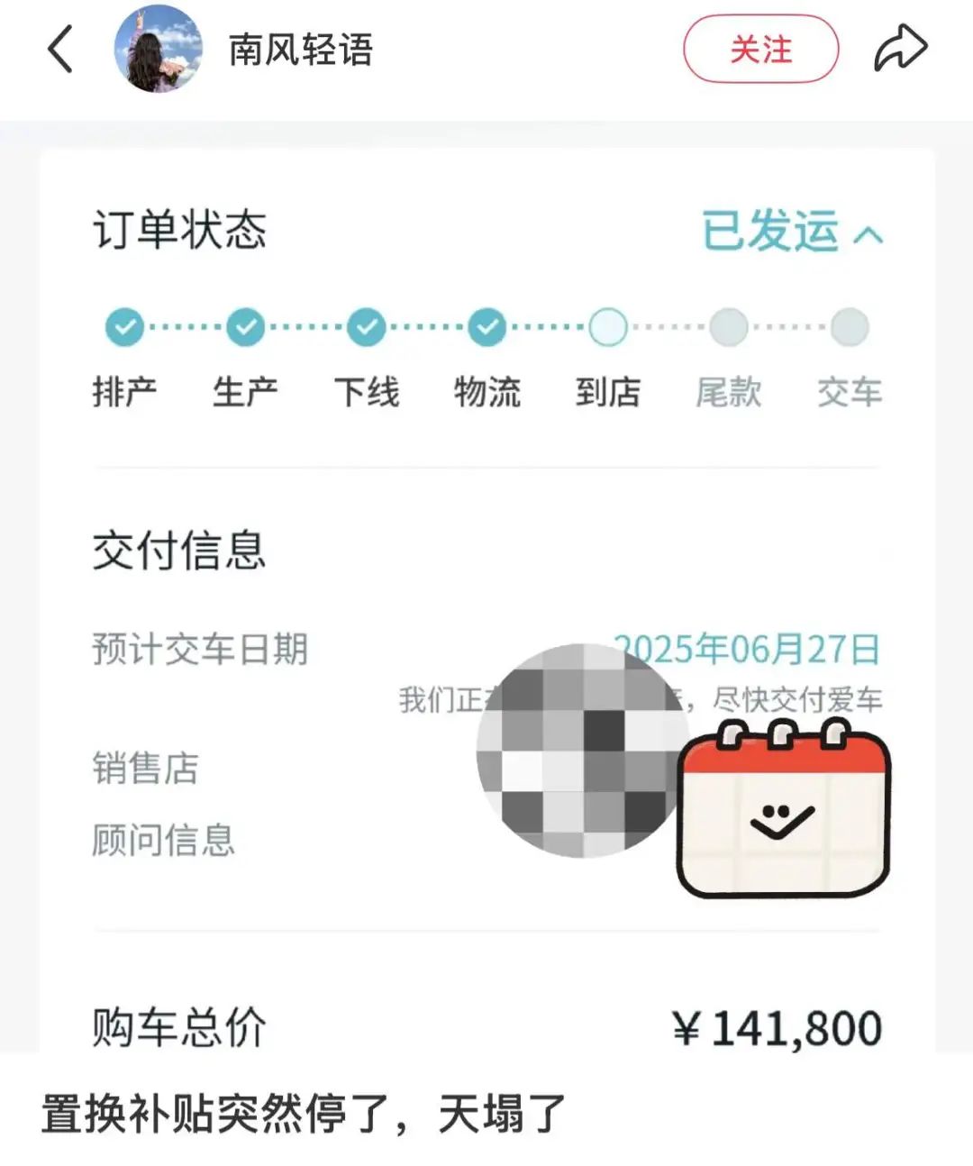 一方面,他们不掌握补贴的时间节奏。比如新疆网友“南风轻语”在小红书平台上发帖称:“置换补贴突然停了,天塌了。”她自述,今年4月缴纳5000元定金订购新车后,新疆6月突然暂停置换补贴。按规则需在6月15日前开具购车发票才能享受2万元“厂补+省补”,但车辆6月7日才从厂家发运,极大可能无法及时到店开票。