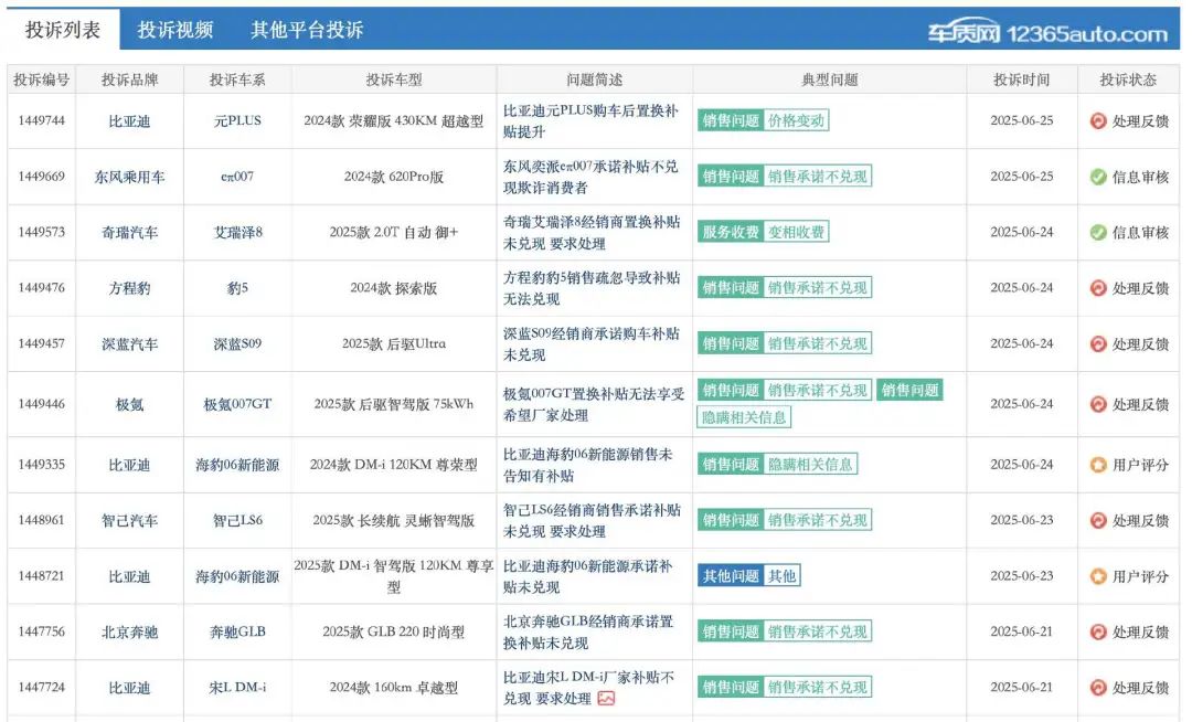 消费者不仅因黄牛担惊受怕,还要为厂家的空头支票日日维权。在车质网上,几乎每天都有消费者投诉汽车补贴久不兑现的问题,涉及品牌范围极广。