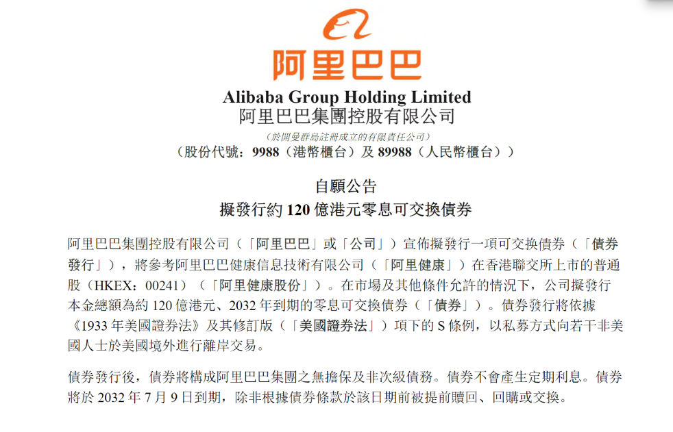 7月3日,阿里巴巴集团发布公告,计划发行本金总额约120亿港元、2032年到期的零息可交换债券。