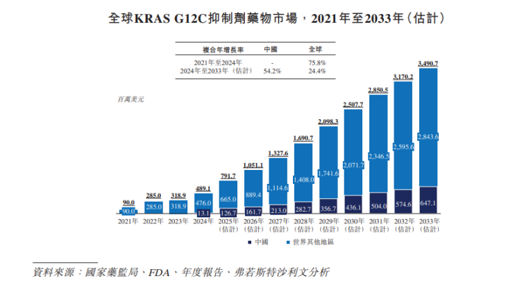 值得一提的是,KRAS G12C突变是NSCLC发病中最为常见的癌基因突变,相关细分赛道增长潜力也正在释放。弗若斯特沙利数据显示,全球KRAS G12C抑制剂药物市场预计将从2024年的4.891亿美元快速增长至2033年的34.907亿美元,复合年增长率为24.4%。
