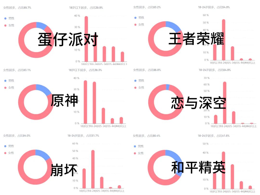 另外尽管这些热门游戏话题的用户画像共同点都是女性用户居多,但具体来看仍有差异:《和平精英》男性用户占比明显高于大盘;作为女性向游戏《恋与深空》女性用户占比最高;《原神》作为二次元游戏,特点是18岁以下人群跟18-24岁人群占比相当。