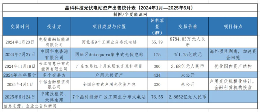 华夏能源网获悉,6月25日,晶科科技(SH:601778)宣布,拟将下属4家工商业分布式光伏电站项目公司名下的光伏电站设备全部销售给中建投租赁,并同步将上述项目公司的持股平台横峰晶格的100%股权转让给天津金建。本次交易对价合计2.87亿元,涉及光伏电站并网装机容量合计约76.55MW。