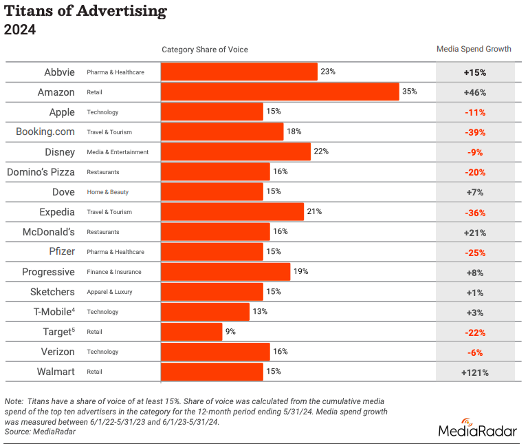 类目寡头化——车险(Progressive、GEICO)、电信(Verizon、T-Mobile)和流媒体(Disney)所在赛道,消费者选择相对集中,头部品牌为了争夺有限心智,不惜不断加码投放。