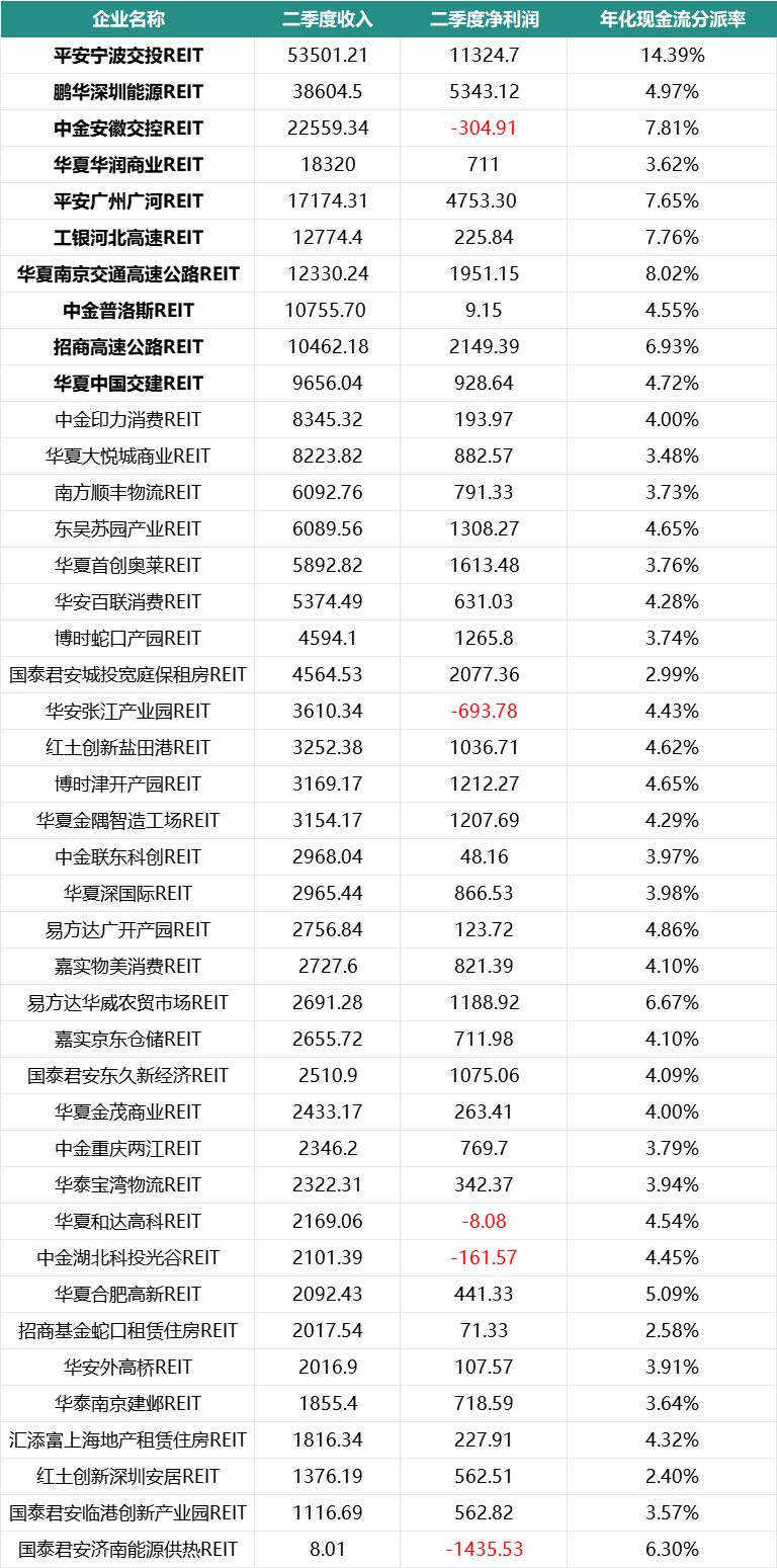 从业绩层面,据睿思网梳理的42家上市REITs,二季度累计实现营业收入超31亿元,其中有9只单季收入超亿元;42家公募REITs累计净利润约4.6亿元,其中14只单季利润超千万,不过有5家在二季度录得了净亏损。另外,42家REITs的平均年化现金流分派率为4.84%。