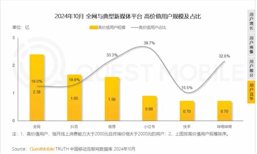 同时,快手困囿于高价值用户(即月线上消费能力及终端价格均大于2000元)的增长。QuestMobile数据显示,截至2024年10月,快手的高价值用户比为15.5%。不仅低于全网19%的平均值,而且是抖音、微博、小红书、B站中最低的。