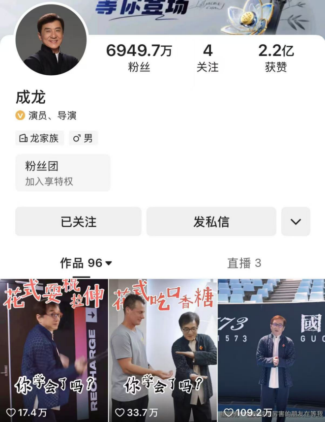 快手也有多位明星陷入停更状态。拥有7000万粉丝的成龙,2021年入驻快手,基本保持月更,自今年2月停更至今;2400万粉丝的迪丽热巴已在2023年停更;杨幂也停更于去年2月。
