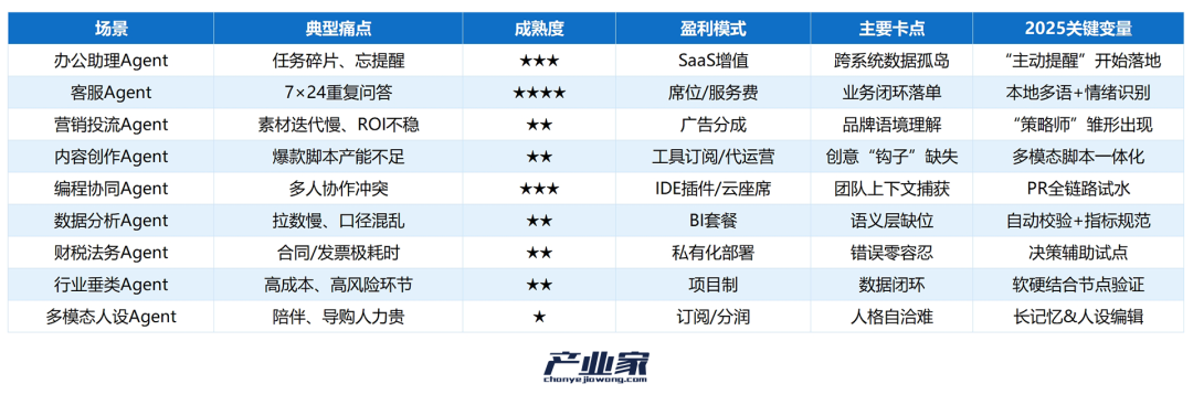 这一类 Agent 的成熟度完全取决于行业深度与企业数字化基础。目前仍以项目制交付 + 本地部署为主,难以快速规模化。