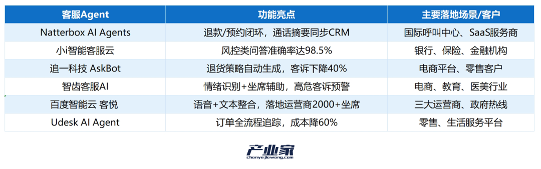 例如百度智能云客悦支持 TTS 坐席声音定制, 能够复刻金牌销售员的声音,可自动分发工单、同步 CRM 记录;智齿客服AI 主打情绪识别和“人工+AI”混编,高危客户的拦截准确率超过 90%;小i客服云 在金融行业市占率第一,风控问答准确率达 98.5%。