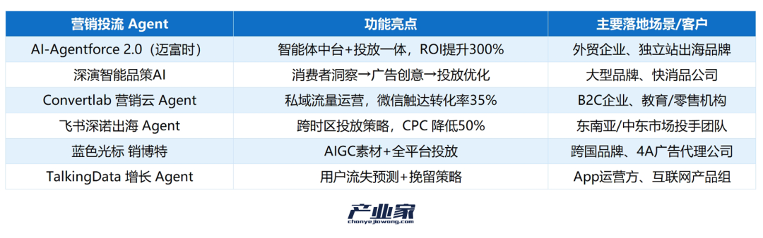 像阿里妈妈万相 AI 已能完成“商品分析-图文生成-落地页匹配”的链路,提升投放 ROI 在部分品类中达 20%;深演智能“品策AI” 直接将用户洞察、脚本生成和多平台发布整合成一站式平台;迈富时 AI-Agentforce 2.0,则主打出海客户,一些外贸客户称 ROI 提升了 3 倍。