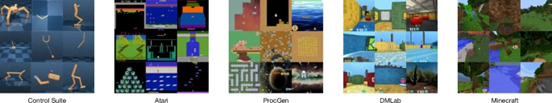 ▷图3. 从 Atari 游戏中的机器人运动和作任务、程序生成的 ProcGen 关卡和需要空间和时间推理的 DMLab 任务,到复杂而无限的 Minecraft 世界,Dreamer算法都取得了成功,1次配置解决150种多任务. 图源:[1]。