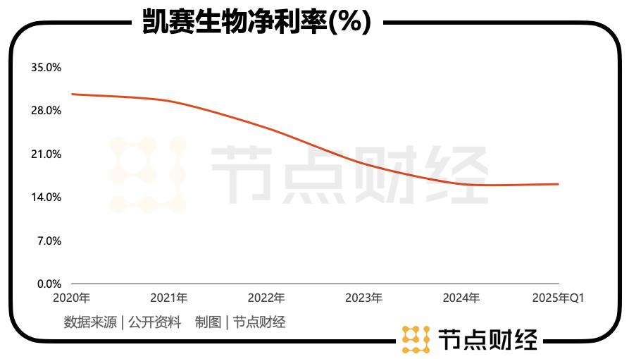 事实上,凯赛生物净利率自2020年创出30.55%的高点后便步入“下坡路”,2021年为29.43%、2022年为25.10%、2023年为19.32%、2024年为16.04%,2025年Q1为16.03%。