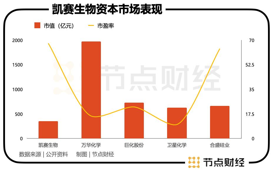 但若论估值,凯赛生物动态市盈率(PE)接近68倍,遥遥领先万华化学约16倍,巨化股份约22倍,卫星化学将将10倍,也优于合盛硅业约64倍。