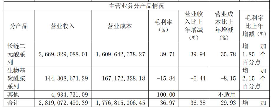 其中,长链二元酸系列”产品贡献收入26.7亿元,占比超过90%。可见,虽然号称是多业务并举,但凯赛生物“单腿走路”的特征仍很明显。