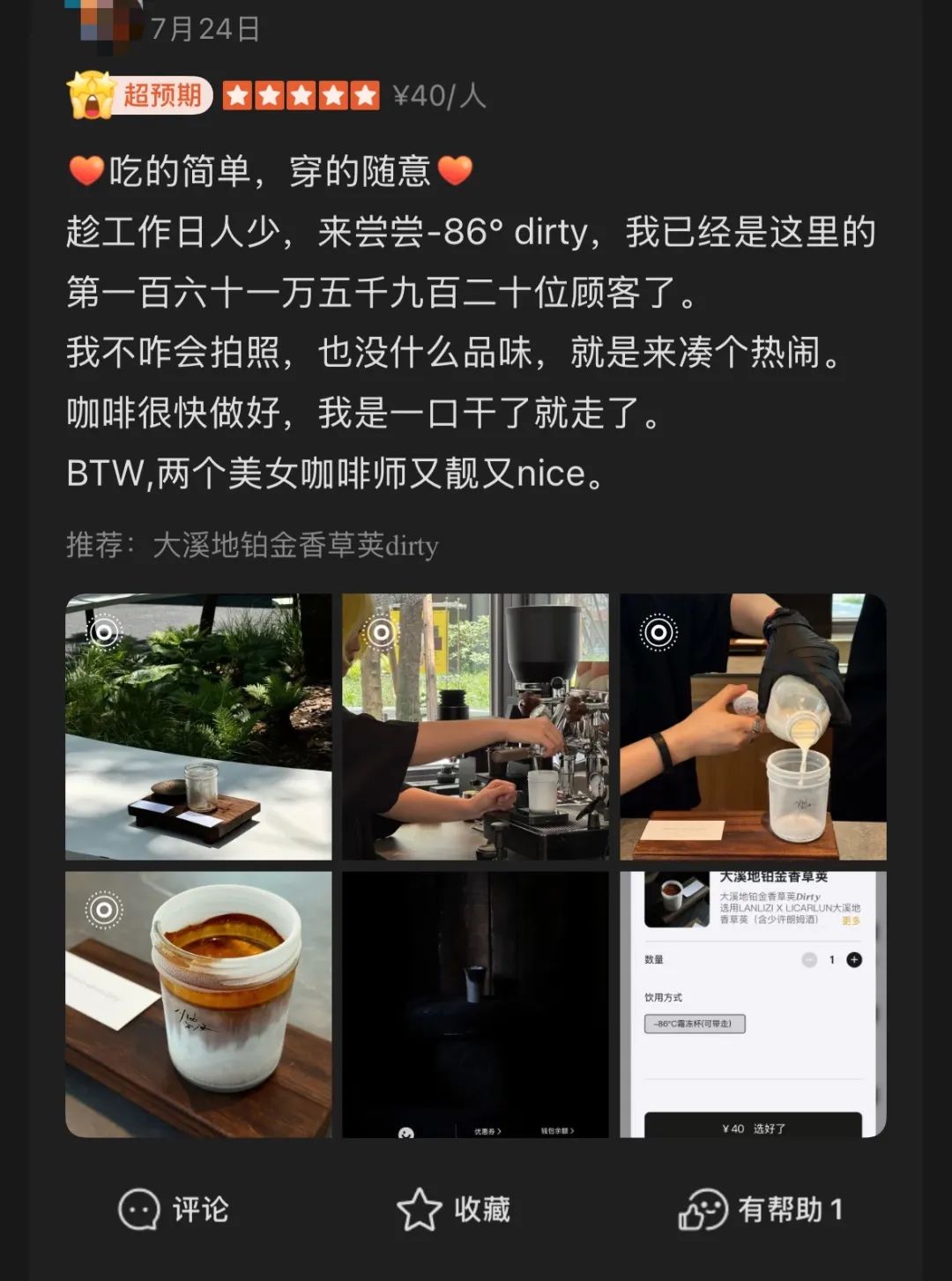 即便价格不低,热度仍居高不下。剁椒Spicy检索发现,这些店铺大众点评里的最新评价,多是慕名前来品尝-86℃咖啡的消费者,不少人提到“为了拍照打卡来的,味道没太记住,主要是体验这个过程”“30多秒就没了最佳口感,感觉有点仓促,但拍出来的照片很出片”。