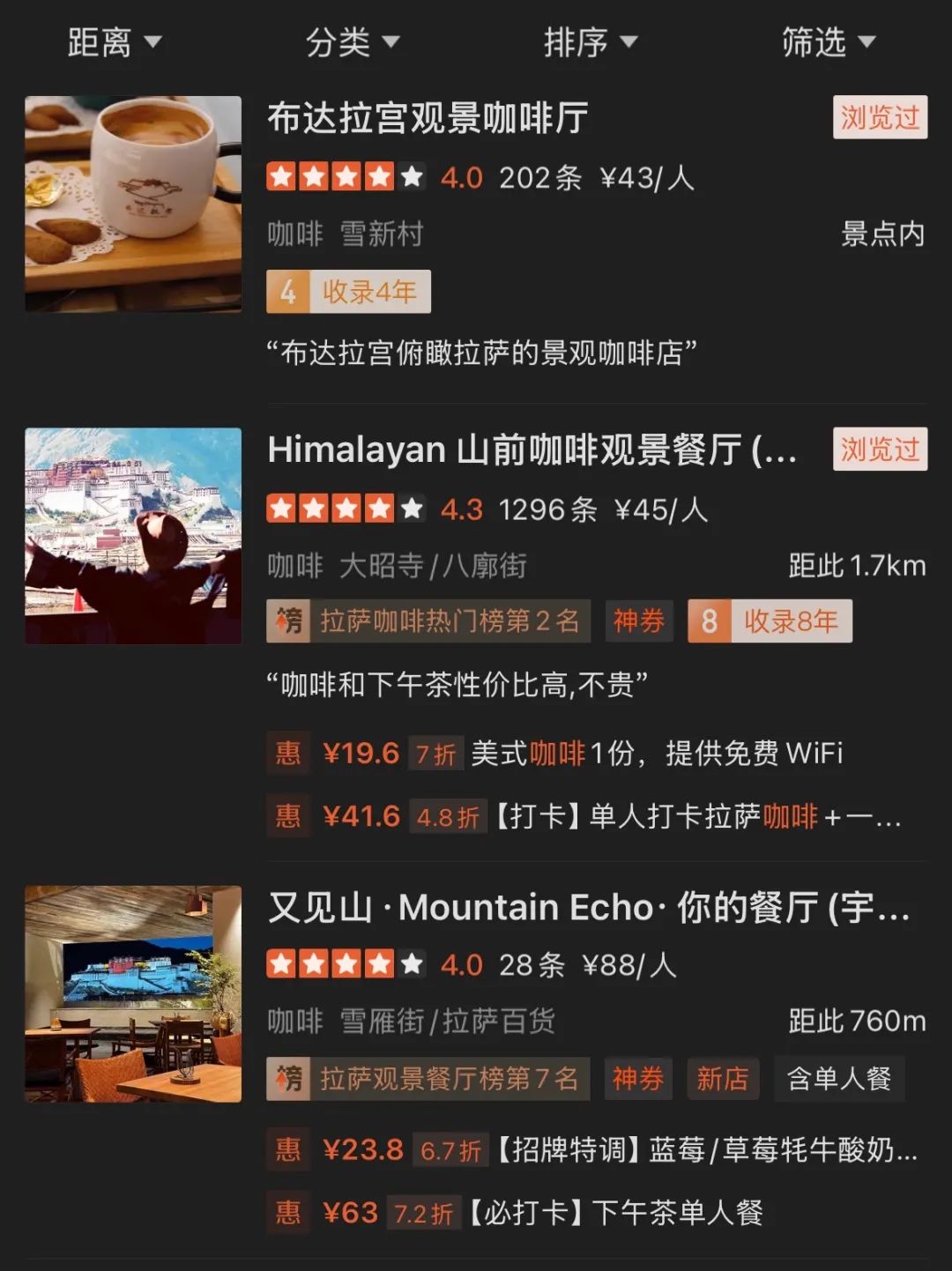 拉萨一批“布达拉宫咖啡店”的走红正是典型例证,剁椒Spicy检索发现,在大众点评上,标注“布达拉宫店”的本土咖啡店不少于10家,甚至不少店直接标注了“布达拉宫观景店”。