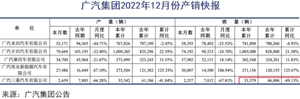 翻阅广汽集团月度销售报告,到2023年4月,广汽三菱的数据已被归于“其他”序列。2022年,广汽三菱销量仅剩3.3万辆,同比腰斩。