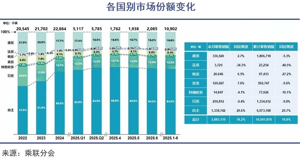 乘联分会数据显示,6月,主流合资品牌零售51万辆,同比增长5%,其中日系品牌零售份额为12%,而这一数字在2022年还有20%。前六月,自主品牌实现25.7%的增长,日系同比下滑9%,而且德系、法系、美系、韩系均已步入下坡路。