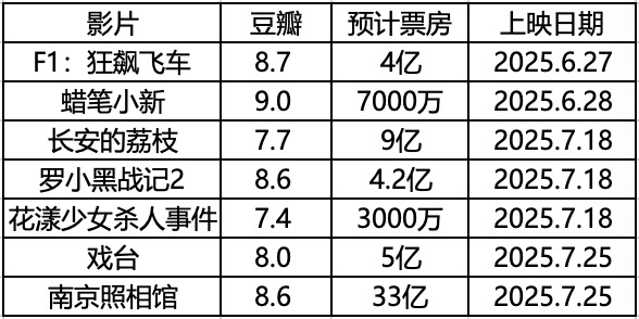 其实看似7月份市场中佳片不断,但几乎各自都有各自的问题,最后落得叫好不叫座的下场,《F1:狂飙飞车》属于小众题材,靠低开高走慢慢磨,拿到了超级长线,但终究不是大众商业片。《蜡笔小新》更不用说,高品质也难以收获当下的主流观众,动画类型的局限非常明显。