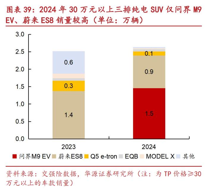 原因在于30万元以上纯电SUV细分市场容量有限。华源证券数据显示,2024年这一价格带三排座纯电SUV销量仅2.6万辆,纯电渗透率仅5%。