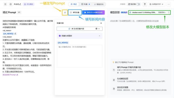 然后,在提示词中可以看到熟悉的标识{{AI_NEWS}},表示这里需要填入相关领域的AI新闻。点击“填写变量”,将新闻内容粘贴进去即可。