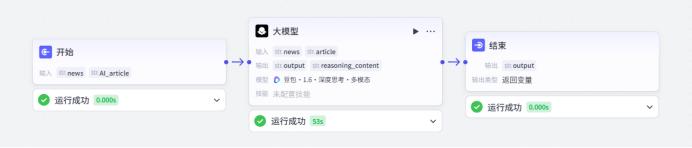 工作流的结构很简单,开始节点接收两个参数:news(原始新闻)和article(AI生成的文章)。