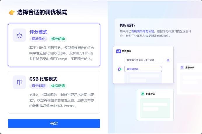 PromptPilot提供了两种调优模式,评分模式类似于“简答题”,需要用户填写分数、评价意见(可选)和理想回答(可选),GSB比较模式则类似于“选择题”,需要用户对答案进行比较,并给出Good、Same和Bad的判断。